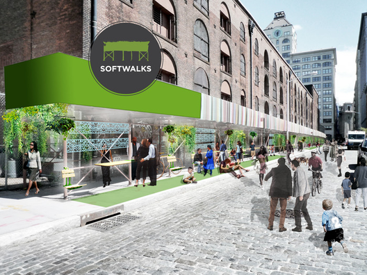 Softwalks transforma los andamios de construcción en espacios públicos para todos, a través de asientos y maseteros crean un lugar de detención para los peatones.